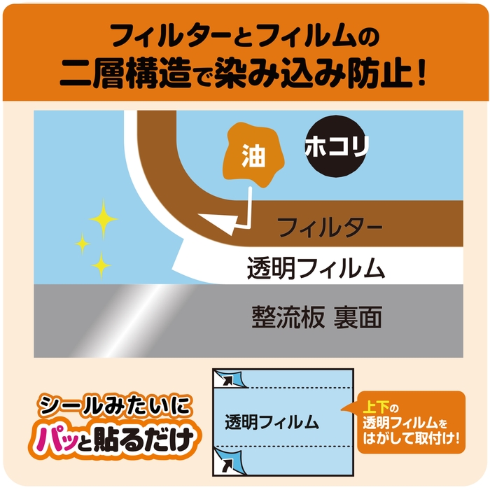 今回、油煙の通り道となる整流板は、表だけでなく裏も汚れるという事実から裏側の汚れ防止ニーズにも着目し、これまでなかった整流板裏専用の商品として発売。特に汚れる中心部分はフィルターとフィルムの二層構造とすることで汚れをしっかりガードする設計です。