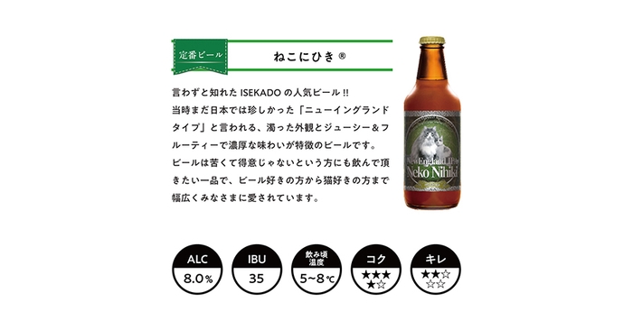 「ねこシリーズ」の始まりはISEKADOと「Yuya Boys」とのコラボレーションビールとして、ISEKADOの人気定番商品「ねこにひき®」をフィーチャリングした「ねこさんびき」を限定醸造したことでした。