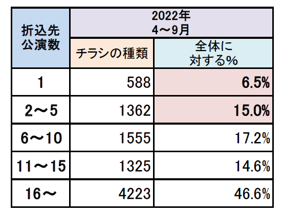 2022年4~9月にお預かりしたチラシのうち、折り込み先を1~5公演に絞って申し込まれたチラシは21.5%でした。観劇客に対してチラシを利用し宣伝するにあたり、予算規模に応じターゲットを絞っての宣伝を希望する団体もいらっしゃいます。