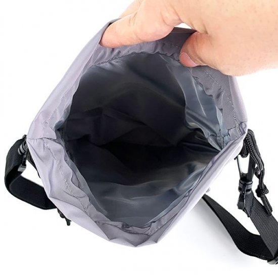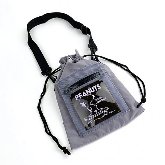 シックなミディアムグレーのバッグも、ご紹介します。巾着として口を絞った状態です。スケボーに乗ったスヌーピーのデザインもイケてます♪