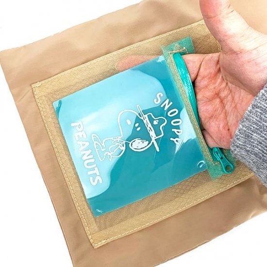 中央にはファスナーポケットがあり、スヌーピーのイラストがデザインされています。ベージュの本体にブルーグリーンのポケットがアクセントになっていて、シンプルながらワンポイントがかわいいバッグです。