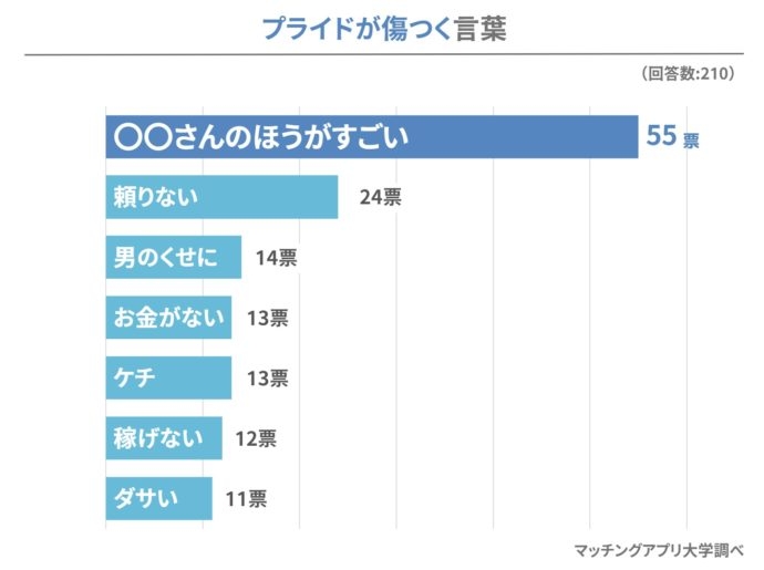 210名の男性に、女性に言われたくない「プライドが傷つく言葉」を尋ねるとダントツの1位に選ばれたのは、「〇〇さんのほうがすごい」でした。発言した側に比較したつもりがなくても、「〇〇さんのほうが」と言われると、男のプライドは深く傷ついてしまうようです。ほかの人と比べられる・劣っていると感じる言葉は絶対にNGですね!