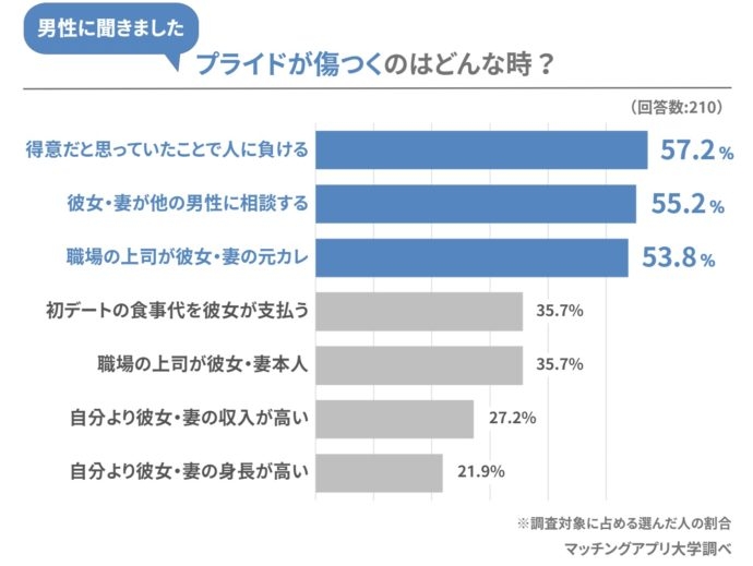 プライドはどんな場面で傷つきがちなのか、男性に本音を聞いてみました。1位は「得意だと思っていたことで他人に負ける」の57.2%。2位は「彼女(妻)が他の男性に相談する」で55.2%。3位は「職場の上司が彼女(妻)の元カレ」の53.8%となり、上位3つはいずれも半数以上の男性が「プライドが傷つく」と回答しました(※複数回答)。