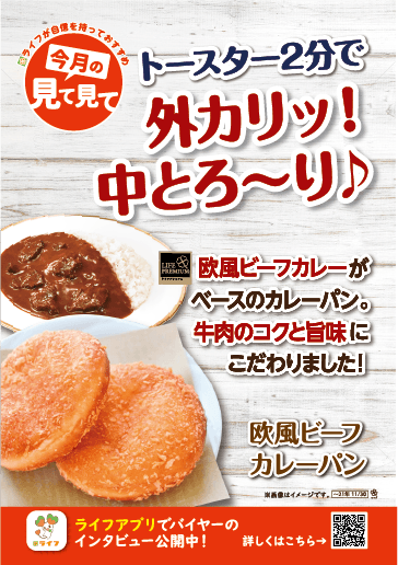 ライフが自信を持っておすすめする「今月の見て見て」の首都圏11月商品に選ばれたライフプレミアム「欧風ビーフカレーパン」は、ライフプレミアム「お肉がたっぷり入った欧風ビーフカレー」をベースに作ったカレーを使用したライフオリジナルのカレーパンです。外はカリッと中はとろ~りな食感をお楽しみいただけます。