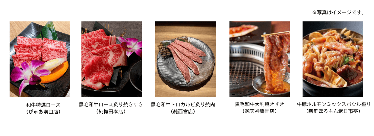 対象店舗は「焼肉レストランぴゅあ」「焼肉本舗ぴゅあ」「焼肉すき焼き純」「弐日市亭」で、いずれも全国の産地から仕入れた国産黒毛和牛・国産豚を中心に、お肉の美味しさを存分に楽しめるお店です。