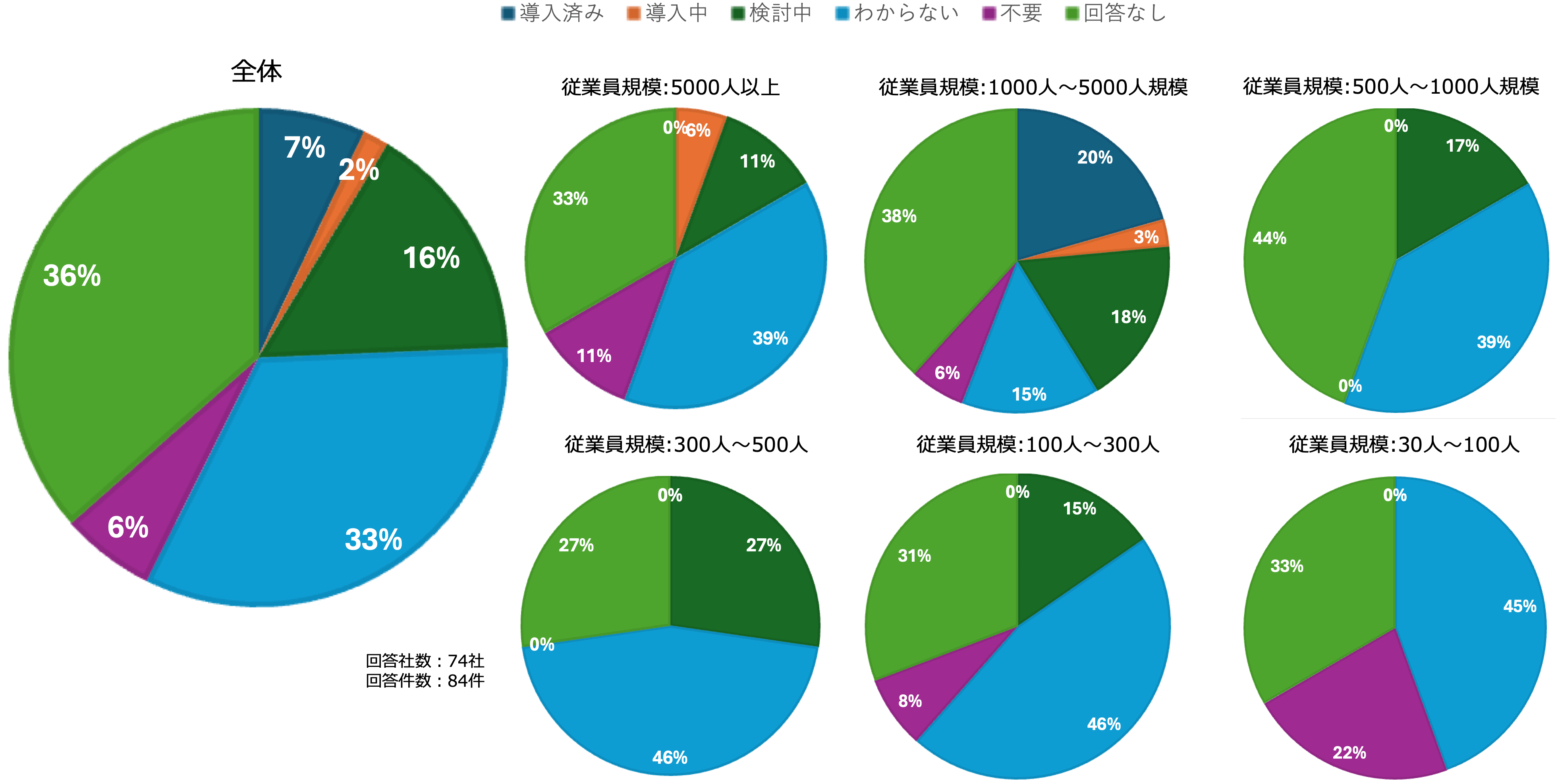 約25%の企業がイノベーションの仕組みを「導入済み」「導入中」「検討中」と報告し、特に100名以上の企業でイノベーション活動への取り組みが顕著であることが分かりました。