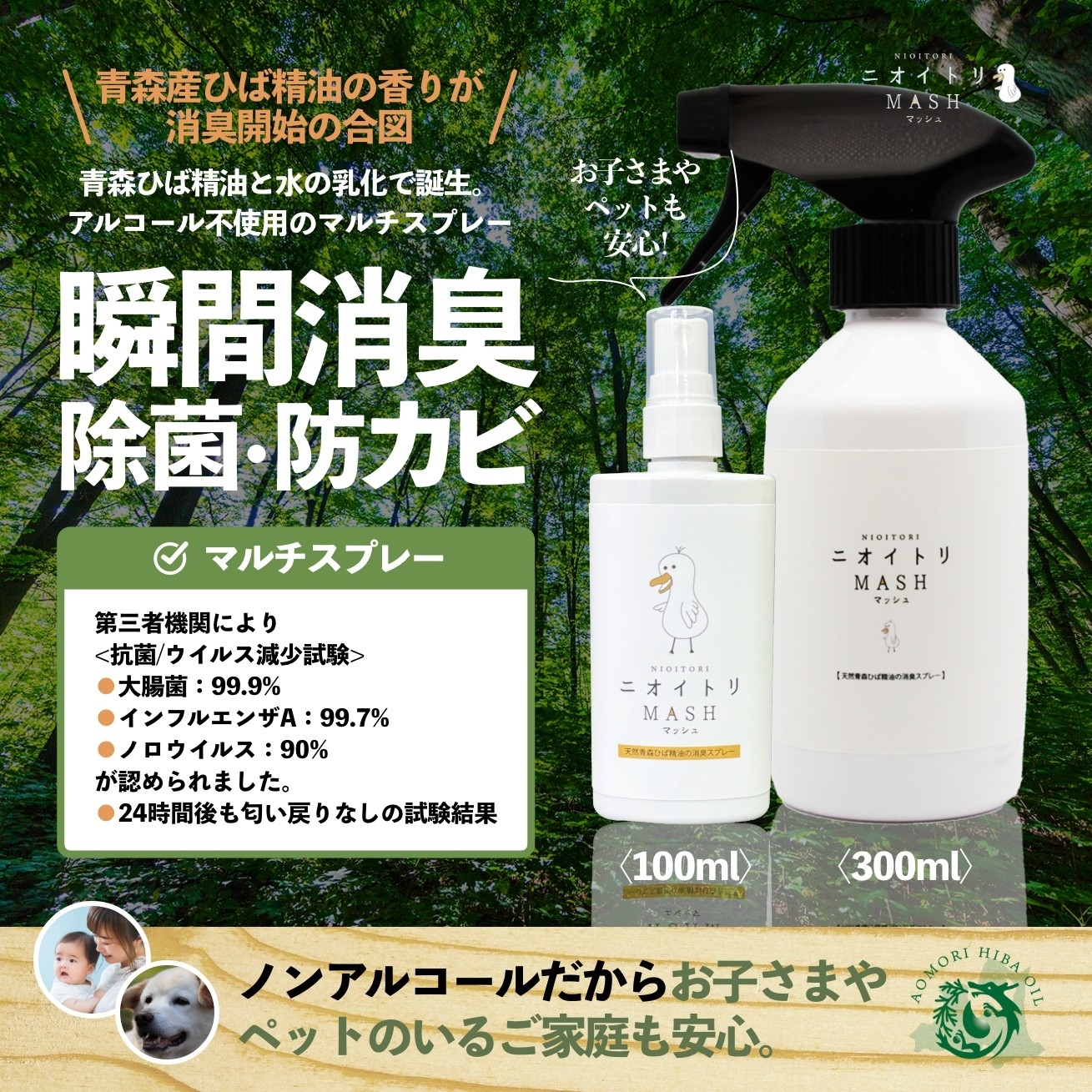 青森ひば精油を活用した製品を展開する株式会社tappi.lab(本社:神奈川県川崎市、代表取締役:園田 孝一、以下当社)の「ニオイトリMASHUU(マシュー)シリーズ」が、楽天シニアの「厳選セレクション特選品特集」に9月8日より掲載されました。MASHUU300mlお買い上げの方に「ひば衣」(ひばのカンナ屑)をプレゼント。MASHUUは、「青森ひば精油」と水で出来た消臭・防カビ・虫除けアイテムで最大の特徴は、自社独自技術開発によって、従来は困難とされていたアルコール類やグリセリンを使用せずにひば精油と水の乳化に成功し、防腐剤、着色料、香料無添加によるひばの自然素材そのままに消臭、防カビ、虫除けを実現。お子様やペットのいるご家庭にも活用していただけます。