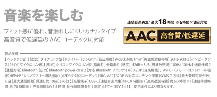 省電力、高速通信のBluetooth® 5.0搭載したポケットサイズの完全ワイヤレスステレオイヤホンです。絡まりの原因となるコード類をなくし、日常生活の中でいつでも音楽を楽しめます。iPhoneで採用している高音質・低遅延の「AAC」に対応し快適な音質を楽しめるのも特長です。イヤホンはフィット感に優れ、音漏れしにくいカナルタイプ。コンパクトな充電ケースはイヤホンを約3回フル充電できます。フィット感を選べる3サイズのイヤーピース付属。[連続音楽再生時間:最大6.0時間] [連続通話時間:最大6.0時間][連続待ち受け時間:最大70時間][イヤホン充電時間:1.5時間]