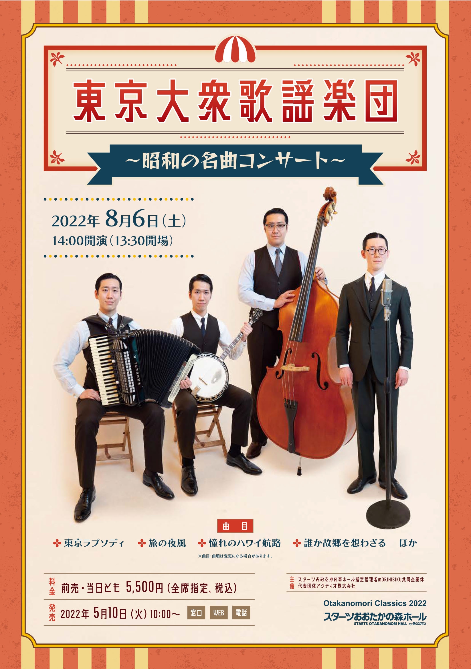 スターツおおたかの森ホール指定管理者MORIHIBIKU共同企業体 代表団体アクティオ株式会社主催『東京大衆歌謡楽団~昭和の名曲コンサート~』が2022年8月6日(土)にスターツおおたかの森ホール(千葉県流山市)にて開催されます。チケットはカンフェティ(運営:ロングランプランニング株式会社、東京都新宿区、代表取締役:榑松 大剛)にて5月10日(火)10:00より発売開始です。