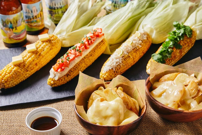当イベントでは、ビールに合う2つのメニューを提供。1つ目のチーズフライドポテトは、トマム牛乳(*7)からつくった熟成チーズと肉汁の旨味が凝縮されたグレイビーソースをかけて仕上げます。塩味の効いたチーズとグレイビーソースがよく合い、ビールがすすみます。2つ目は、夏の北海道を代表する食材のとうきびです。4種類のオリジナルフレーバー(醤油バター、サーモン、カレー、チーズバター)を楽しめます。