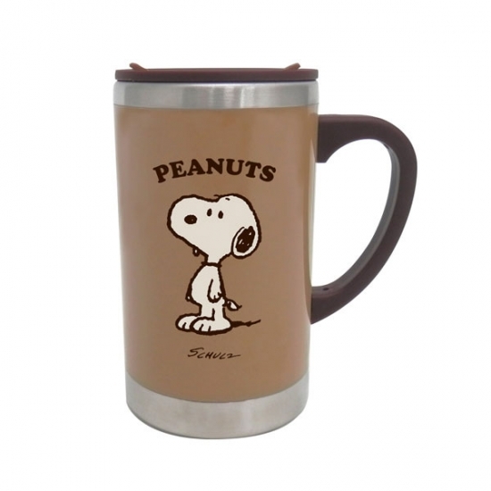 スヌーピーのキュートなイラストにPEANUTSのロゴ入り♪持ち手もやフタもブラウンで統一されていて、暖かそうな配色ですよね。