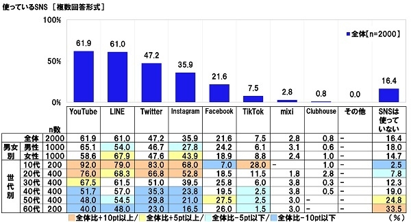 ここで、使っているSNSを聞いたところ、「YouTube」(61.9%)が最も高く、次いで、「LINE」(61.0%)、「Twitter」(47.2%)、「Instagram」(35.9%)、「Facebook」(21.6%)となりました。他方、「SNSは使っていない」は16.4%となり、SNSを使っている人の割合は83.6%でした。