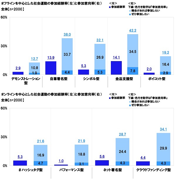 他方、オンラインを中心とした社会運動では、参加経験率は、「#ハッシュタグ型(SNSで#○○とつけてリツイートやシェアなど拡散する)」5.3%、「パフォーマンス型(話題になるよう行動する)」1.0%、「ネット署名型(change.orgなどネットで署名を集める、ネットで署名を行う)」5.6%、「クラウドファンディング型(寄付と賛同を通じて支援する)」4.4%となりました。