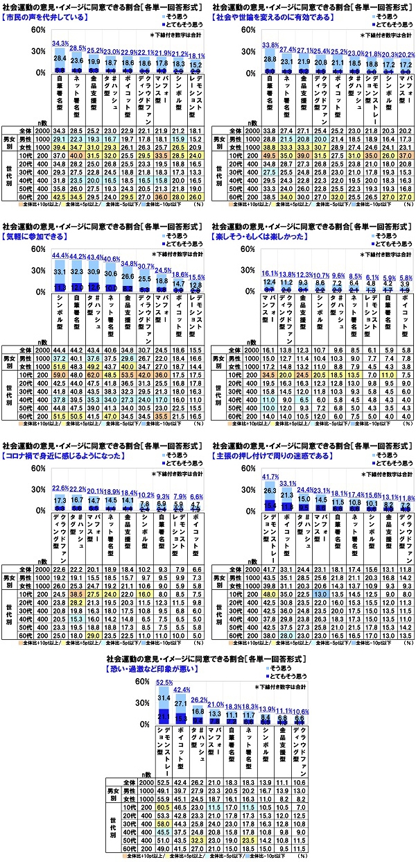意見・イメージごとに、『同意できる』(「とてもそう思う」と「そう思う」の合計)と回答した人の割合をみると、「自筆署名型」や「ネット署名型」、「金品支援型」は「市民の声を代弁している」「社会や世論を変えるのに有効である」とのイメージが多くなった一方で、「デモンストレーション型」や「ボイコット型」は「主張の押し付けで周りの迷惑である」「恐い・過激など印象が悪い」とのイメージが多くなりました。また、「シンボル型」や「ハッシュタグ型」は「気軽に参加できる」、「パフォーマンス型」は「楽しそう・もしくは楽しかった」、「クラウドファンディング型」は「コロナ禍で身近に感じるようになった」とのイメージが多くなりました。
