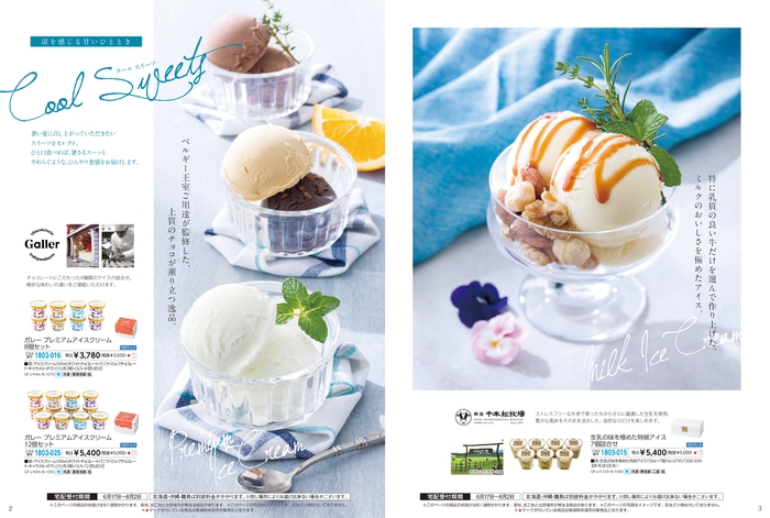 巻頭特集は、中元期に売れ筋のアイス、ゼリー、ジュレ、ドリンクなどを幅広く取り揃えました。中でもおすすめは「生乳の味を極めた特選アイス個7個詰合せ」です。ストレスフリーな牛舎で育った牛から特に乳質の良い牛だけを選んで作られたミルクのおしさを極めたアイスです。