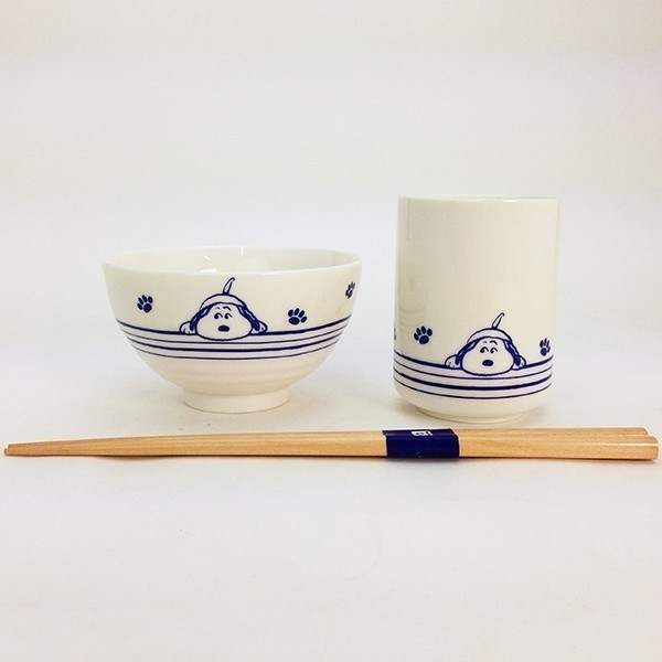 毎日の食事はこれで決まり?もっちりとした顔のスヌーピーが愛らしい、お茶碗と湯呑とお箸のセットです。