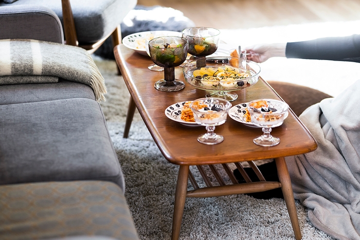 「年に何度か出かけていた映画や観劇も、今は自宅のテレビやパソコンで。だらだらしながら観られるよう、ちょっとつまめるものをソファテーブルに用意します。」