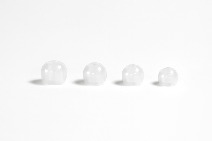 低音域の再現性を高めるため、独自開発の「ディープマウントイヤーピース」を採用しました。一般的なイヤーピースと比較して耳のより奥の広いエリアでフィットする独自形状により密閉性が向上し、豊かな低音再生と極めて安定した装着感を実現します。XS/S/M/Lの4サイズが付属しており、装着感に合わせてお選びいただけます。