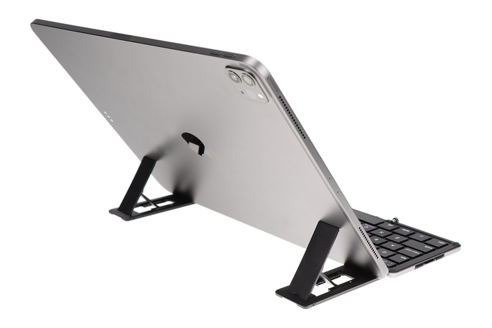 スマートフォン、タブレット端末などを立てかけて使えるよう折りたたみ式のスタンドが付いており、資料作成やタイピングにおいてノートPCさながらの見やすさを実現しました。また、タッチパッドを装備しており、マウスがなくてもポインターを操作可能です。キーボードは英語配列の63キー、キーピッチは17mmと打ちやすい間隔を確保。約300万回の打鍵に対応する高耐久仕様です。