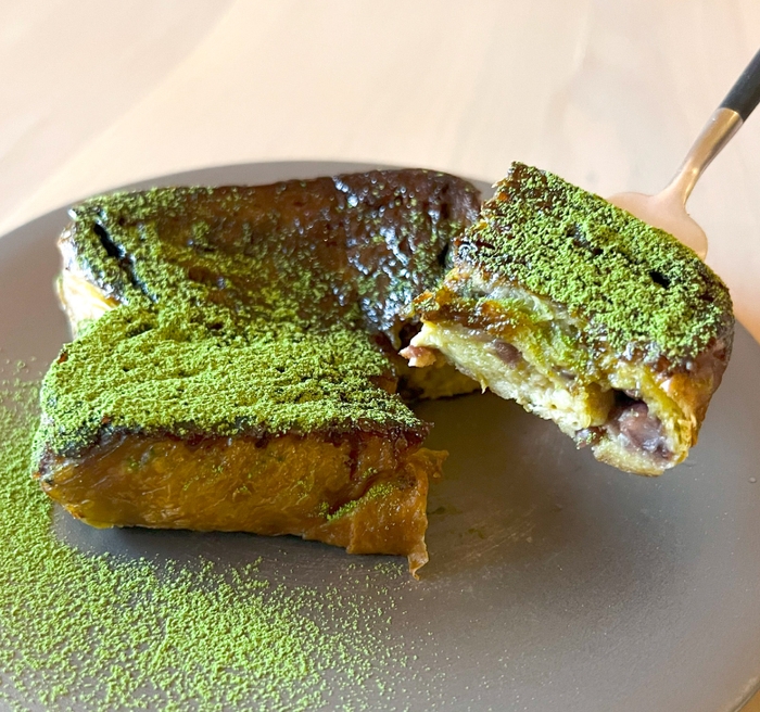 香り高い祇園辻利抹茶と程よい甘さの小倉あんの和の味わいのデニッシュがフレンチトーストに。仕上げに抹茶を振りかけて。