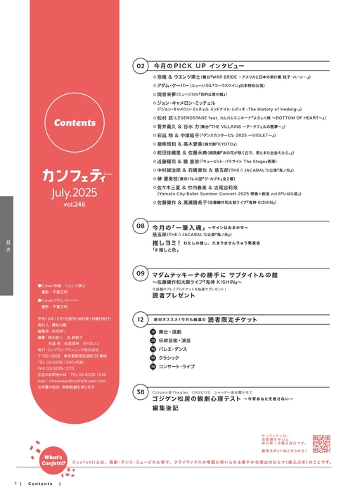 「エンタテインメントを、もっと身近なものに。」を理念とするロングランプランニング株式会社(東京都新宿区、代表:榑松大剛)は、シアター情報誌「カンフェティ」7月号 vol.246 を2025年6月2日(月)に発行いたします。配布場所は、首都圏を中心とした劇場・ショップ・駅など合計1,500箇所以上に設置されます。