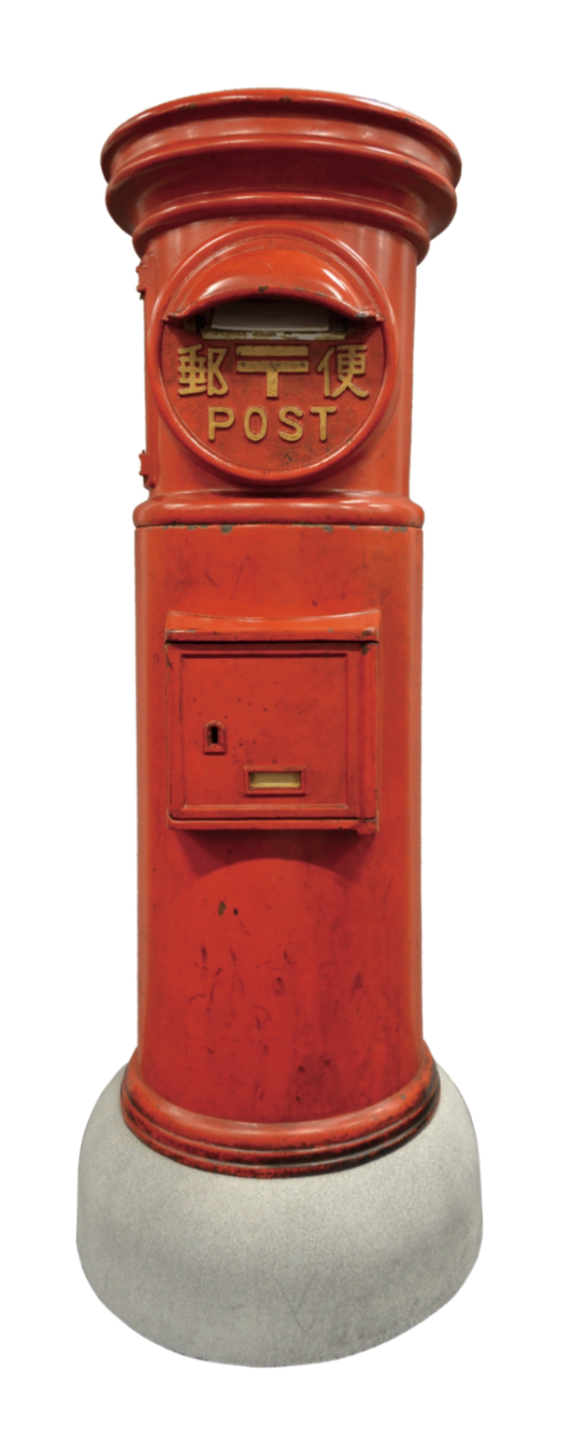 昭和24年(1949)に誕生した郵便差出箱1号丸型、いわゆる赤い丸型ポスト。差入口のある上部と取出口のある下部が別個に作られているので、設置場所の状況に応じて便利な方向に向けて据え付けることができる。