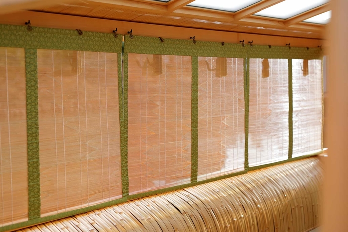 雅な屋形舟「翡翠」を貸し切り、プライベートな空間でくつろぎながら舟遊びを楽しむことができます。翡翠は、京都で古くから親しまれてきた建材や装飾を用いて京都の伝統工芸に囲まれる雅な空間に仕上げた星のや京都専用の屋形舟です。例えば、舟枠には書院造に用いられる北山杉やヒノキ材を使用し、木材の先端を覆う木口かくしには、古くから寺院などの柱や天井の装飾に見られる銅の金具を用いました。舟内には京町屋の犬矢来をイメージした竹の背もたれや、草木花で染め上げた柔らかな風合いのクッションを設えています。また、舟の側面の御簾を降ろすことでプライベートな空間を楽しむこともできます。また、翡翠の屋根には特殊なガラスがはめ込まれており、スイッチを押すことで、雪見障子を開けるように白から透明に色が切り替えられます。嵐山の渓谷と青空を見上げて楽しむことができる、これまでにない屋形舟です。