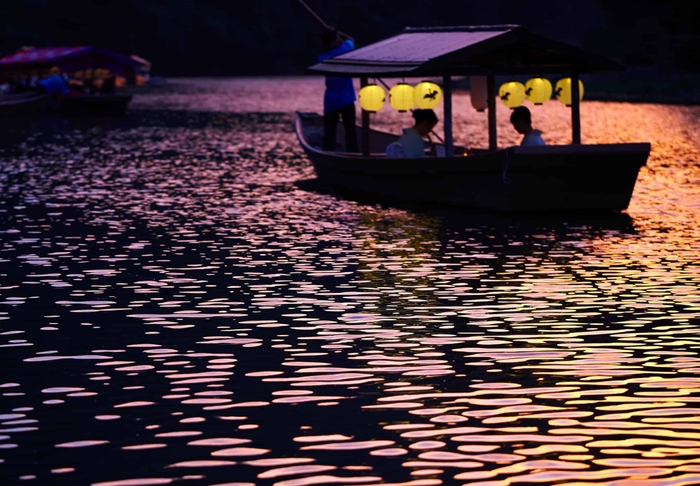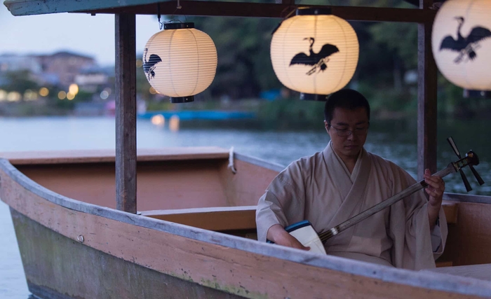 星のや京都から鵜飼が行われる大堰川下流へ向かう間、雅な屋形舟「翡翠」の上では三味線の生演奏に耳を傾けることができます。日中は観光客で賑わう大堰川ですが、夜になると静かになり、三味線の風流な音色が暮れゆく奥嵐山の渓谷にこだまします。鵜飼が始まると、鵜匠による掛け声や太鼓の音で、川の上は日中とは違った賑わいを見せます。目の前で鑑賞する三味線の生演奏と鵜飼の賑わいで、夏の宵の高揚感を味わいます。
