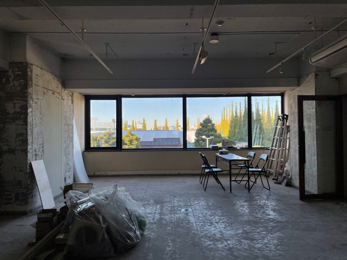 窓際にカウンターを作る妄想が止まりません。窓側の席は取り合いです。広さがやや小さくなる3階も募集していますが天井が貼ってあるスタイルです。この区画も元々天井がありましたが前テナントが抜いてそのままでの引き渡しとなりました。この区画で一般的な事務所仕様にするのは勿体無すぎます。