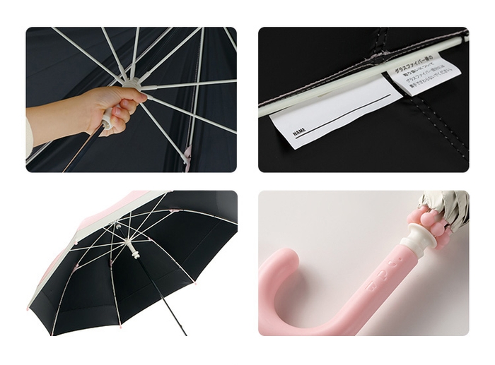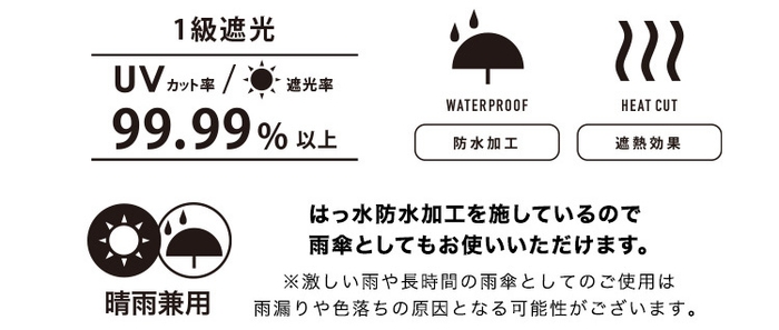 生地裏面にはポリウレタンコーティング加工が施されているため遮熱効果があり、UVカット率・遮光率は全色99.99%以上、裏面は全色黒色なのもポイント。一級遮光なので大人用の日傘と同様の効果を持つ日傘です。またはっ水防水加工も施しているので雨の日もご使用いただけます。