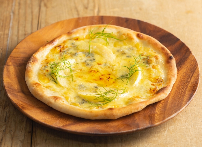 2種のチーズと桃をピザ生地にのせて、ピザ窯で焼き上げました。