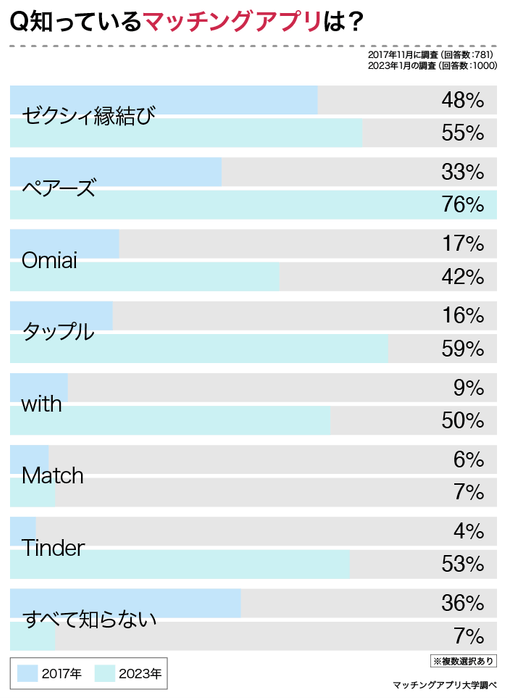 「マッチングアプリ」という言葉が世間に認知し始めた2017年ごろと2023年現在では、その認知度や好感度にどのような変化が起きたのでしょうか?