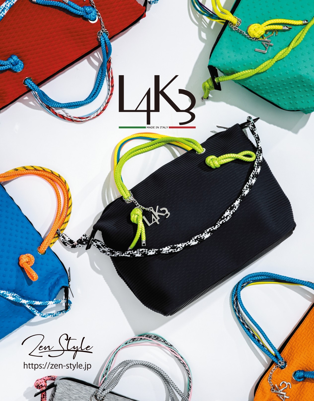 航海用ロープをファッションに取り入れた感度の高いアイテムを展開するイタリアブランド「L4K3(レイク)」から、ウェットスーツの素材でも知られる素材”ネオプレン”を使用したラグジュアリーでキャッチーなバッグが登場。世界でも有数のロープ生産ファクトリーという背景を持つL4K3が生み出すバッグは表情豊かでコーディネートの主役になるアイテムばかり!