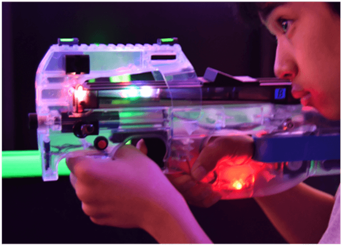 赤外線を使用したハイスペックレーザーガンでプレイしますが、けがや痛みの心配がなく、装備品も不要ですので、子ども同士でも、ファミリーでも安心・安全にサバイバルゲームが体験できます。初めての方には専属のスタッフが丁寧な説明を行い、どなたでも楽しんでいただけるようサポートします。また、プレイ中にはスタッフがマイクパフォーマンスで対戦を盛り上げてくれます。