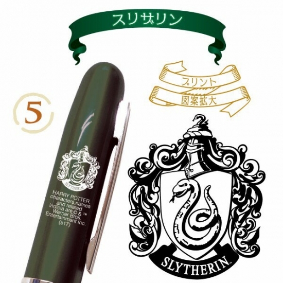 最後はお馴染み、スリザリンです。ヴォルデモートやマルフォイなど、闇の魔法使いが多いことでも有名でしたね。エンブレムのモチーフとなっているのは、ご存知のシンボル、蛇です。グリーンのシンボルカラーは落ち着いた色合いです。
