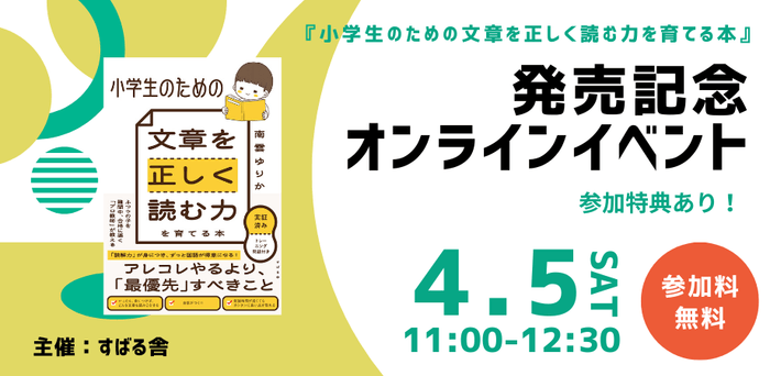 株式会社すばる舎(本社:東京都豊島区、代表取締役社長:徳留慶太郎)は、南雲ゆりか新刊『小学生のための 文章を正しく読む力を育てる本』発売記念【オンラインイベント】を4月5日(土)11時00分より開催します