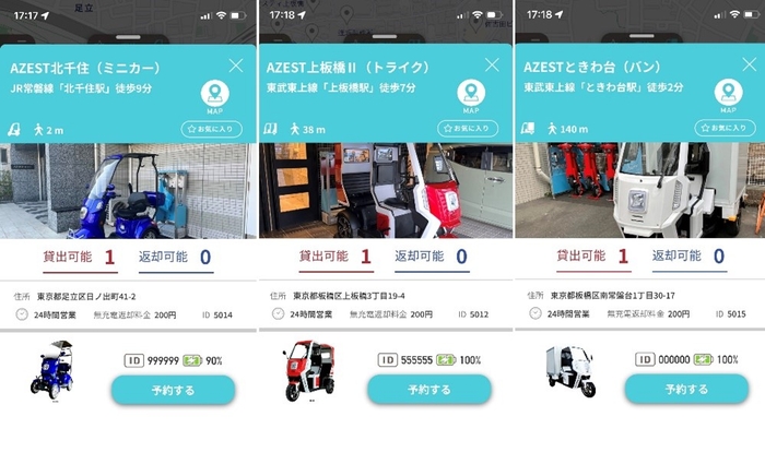 Shaeroアプリでは現在折りたたみ電動バイクの「Shaeroバイク」のみご利用いただけますが、正式サービス開始後には同じアプリで「Shaeroトライク」「Shaeroミニカー」「Shaeroバン」をレンタルしご利用いただくことができるようになります。「Shaeroバイク」と同様にステーション検索、レンタル予約、レンタル開始・返却、電源のオン・オフまでアプリで操作可能です。なお、現行の「Shaeroバイク」のレンタルではレンタル開始したステーションとは別のステーションで乗り捨て返却が可能ですが、追加される3つの車種に関してはレンタル開始したステーションで返却いただく必要があります。