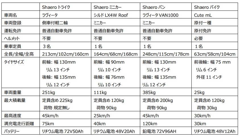 Shaeroは、3月中には「Shaeroトライク」、「Shaeroミニカー」および「Shaeroバン」の運用テストを終えて、一部のステーションにて一般ユーザーもこれらの車両の利用が可能となるように準備をしております。今後は、リゾートエリアや観光地など家族での移動が見込まれるエリアでは「Shaeroトライク」の、また温泉地などあらゆる世代の方が訪れるような観光地では「Shaeroミニカー」のステーションを設置する予定です。また、「Shaeroバン」については、一般利用者の荷物輸送ニーズがあるエリアや大型店舗へのステーション設置や、法人専用機能とセットで物流拠点への提供を検討しております。