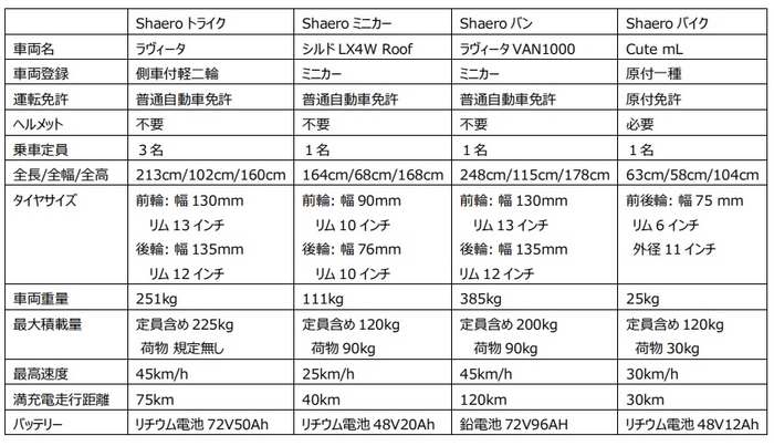 Shaero は、国内では唯一の折りたたみ電動バイクのシェアリングサービスで、都市部での数駅分の距離を、効率的なルートで自在に移動できるエコなツールとして、2021年9月にサービスを開始し、首都圏および沖縄エリアにてサービスの拡大を行っております。Shaeroは、折りたたみ電動バイクのみならず、様々な電動モビリティのシェアリングサービスを通じて、日常生活での移動や観光、配送等のシーンにおいて、選択肢を増やすことを目指しており、昨年11月から運用テスト中の電動デリバリートライク「Shaeroバン」に加えて、観光地等での家族での移動に最適な3人乗りトライク「Shaeroトライク」、シニアの方でも安心して気軽に運転できる1人乗り小型EV「Shaeroミニカー」の運用テストを開始いたしました。