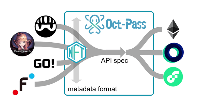 また、イーサリアムのスケーラビリティやトランザクションフィーの高騰などによるNFTの流動性不全を解決するために、特定のブロックチェーンに依存せず複数のブロックチェーン上でNFTを取り扱うためのAPI仕様「Oct-Pass API spec」についても提案するものです。