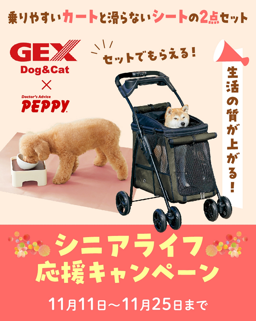 カレンダー事業を柱にペット関連サービス事業などを展開する新日本カレンダー株式会社(大阪府大阪市、代表取締役社長:宮﨑 安弘)は、犬猫グッズ通販サイト「PEPPY(ペピイ)」は、シニア犬の生活向上応援企画として、2024年11月11日(月)よりジェックス株式会社×PEPPYのコラボプレゼントキャンペーンを開始します。「乗りやすいカート&滑りにくいシート」はシニア犬の生活の質(QOL)を向上するとっておきのアイテムたちです。