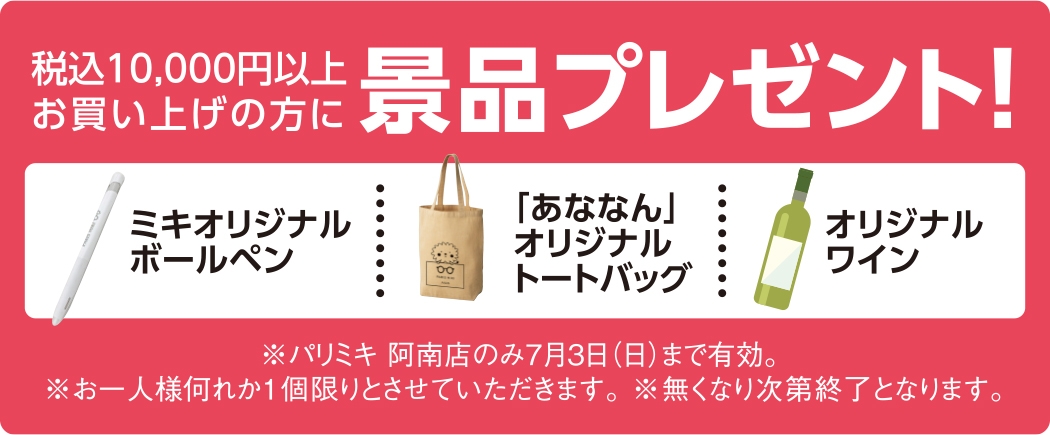税込¥10,000円以上お買い上げで、「あななん」オリジナルトートバッグ、オリジナルボールペン、オリジナルワインの中から、お好きな景品をお一人様いずれか1つプレゼント!