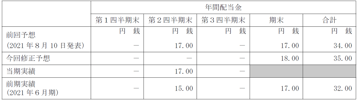 2022年6月期の期末配当予想につきましては、当期の業績動向に加え、内部留保の累積状況や資金需要動向等を総合的に勘案し、前回予想より1円増配し、1株当たり18円に修正することといたしました。