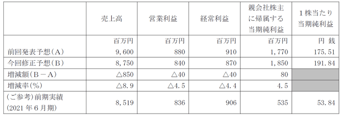 (1)2022年6月期通期連結業績予想数値の修正(2021年7月1日~2022年6月30日)