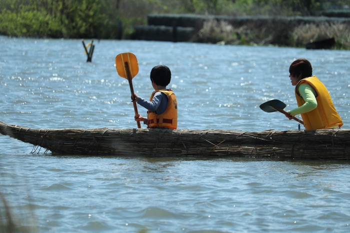 湖岸で自ら葦を刈り、その葦を束ねて自ら葦舟を作り、その葦舟を自ら漕いで、その性能を競う大会を実施します。