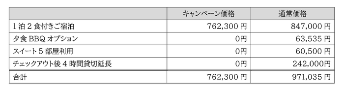 ① チェックイン前、チェックアウト後の貸切利用料金1時間あたり60,500円を最大4時間(242,000円相当)サービス