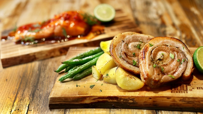 臭みがなく、やわらかい日南もち豚をハーブとガーリックを巻き込んでローストしたうず巻き型が印象的なサイドディッシュです。仕上げにポテトとインゲンを一緒にウッドプレートにのせ、薪窯で焼き上げます。※ディナータイム限定