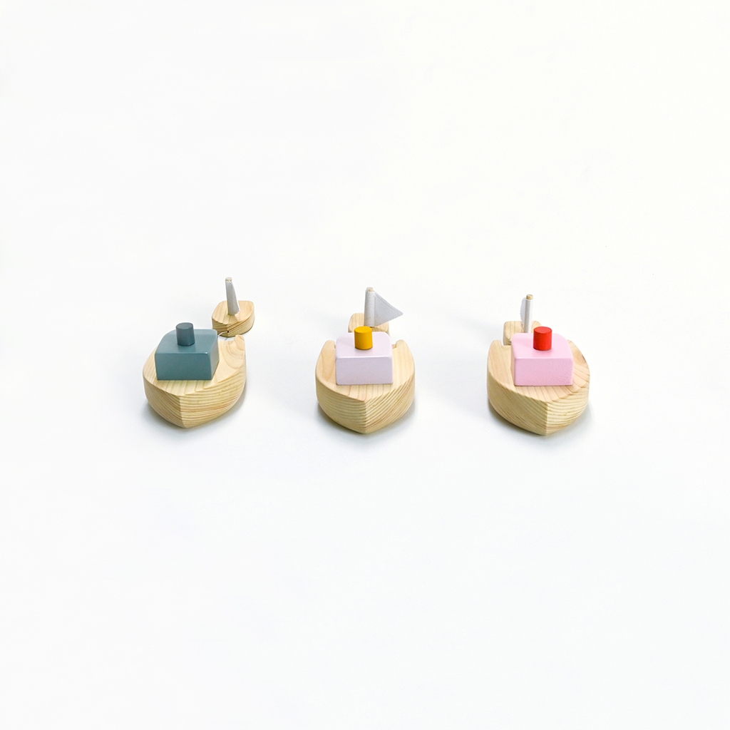 「木製のおもちゃだから、浮かぶだけだろうな」そう思う人も多いかもしれません。しかし、そこにもKaz* Shiomiの強いこだわりがあらわれます。「お風呂などの水辺で遊べる木のおもちゃはたくさんありますが、ただ浮くだけでは、すでに世に出回っているおもちゃと変わりがなくなってしまいます。私は、ものづくりをする上で、大事にしている2つのことがあります。一に、機能性がありインテリア要素の高いデザインであること。そして二に、他と被ることのないオリジナリティあふれる物を生み出すことです。このおふねは、つまみを回して水につけると、くるくるくると可愛く旋回します。お風呂やプールなど水辺で遊べる木製のおもちゃで、自走機能などの仕掛けがついているものは他にはなく、とっても珍しいヒノキのおもちゃです。」