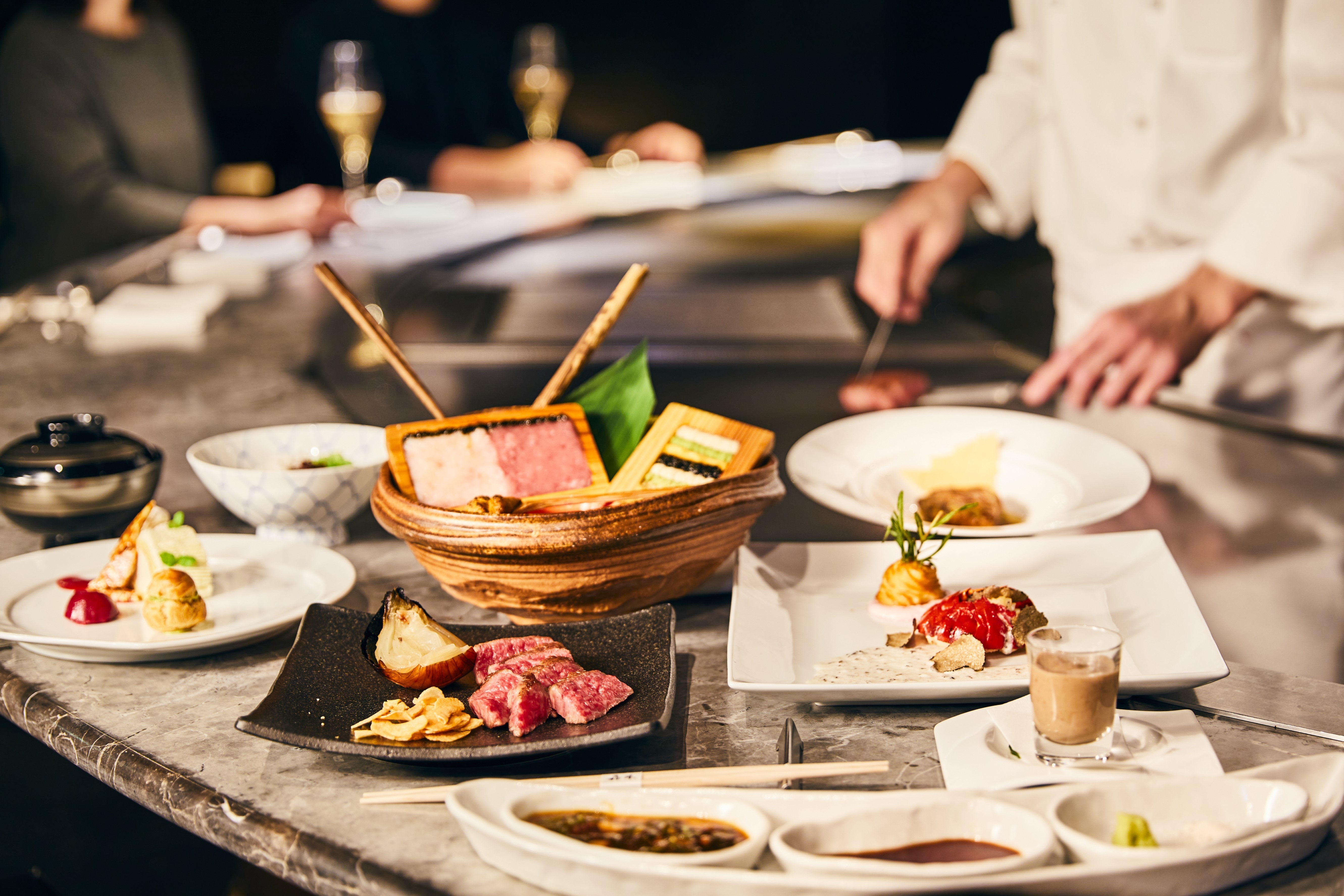 この時期ならではの至高の食材を駆使し、職人が趣向を凝らしてご用意した目にも色鮮やかな品々。盛り付けの細部にまでこだわった前菜やスープ。何よりも職人が目の前で豪快に焼き上げる伊勢海老とタラバ蟹の鉄板焼きや黒毛和牛ステーキはサーロイン、フィレ、シャトーブリアンからお選びいただけるメインは五感を愉しませてくれます。