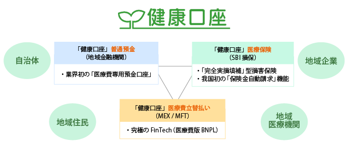 将来の医療費支払いに備える専用口座「健康口座」と、MFTが提供する「健康口座」会員サービスがセットになったサービスです。